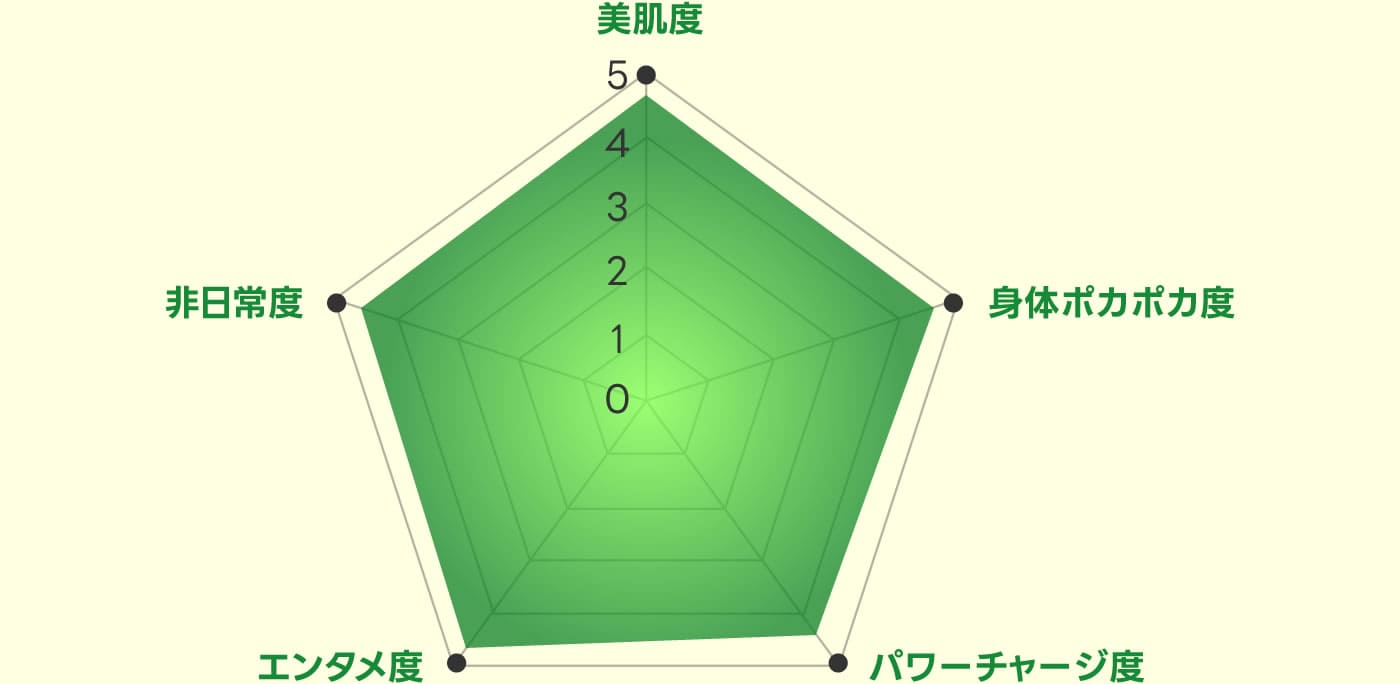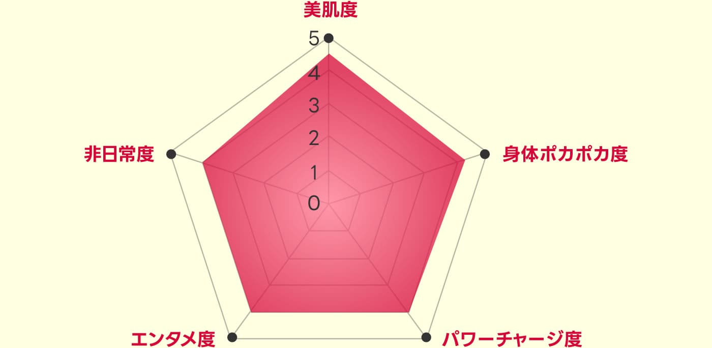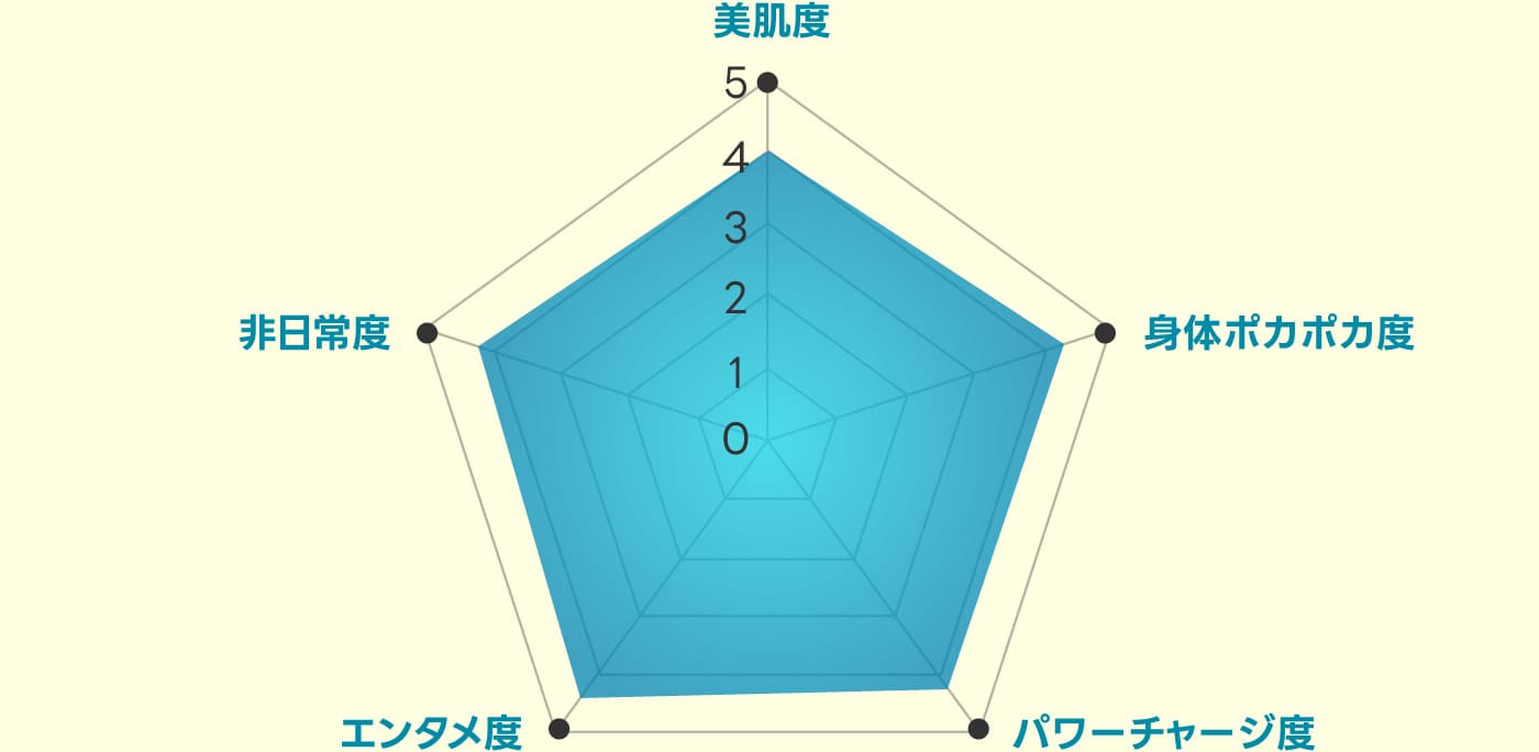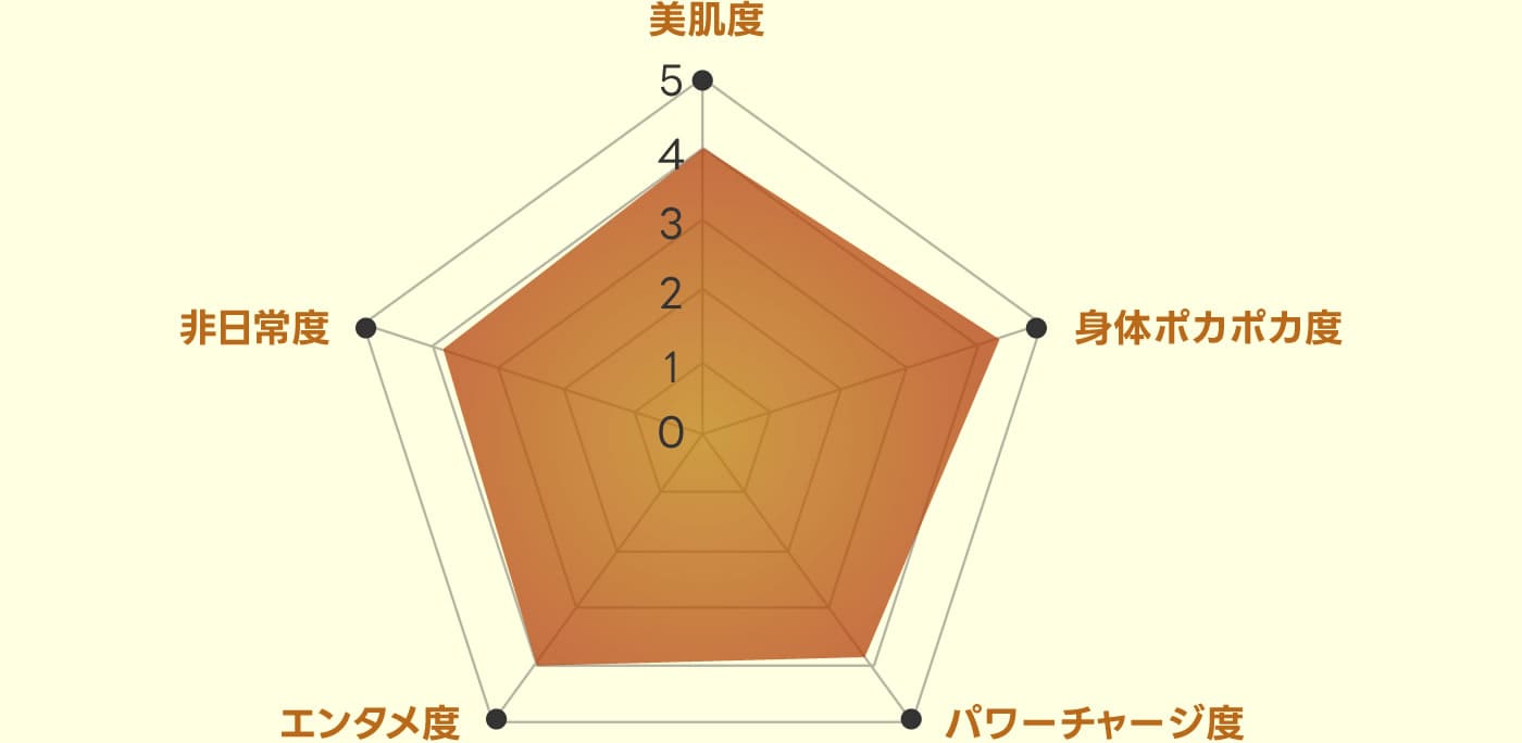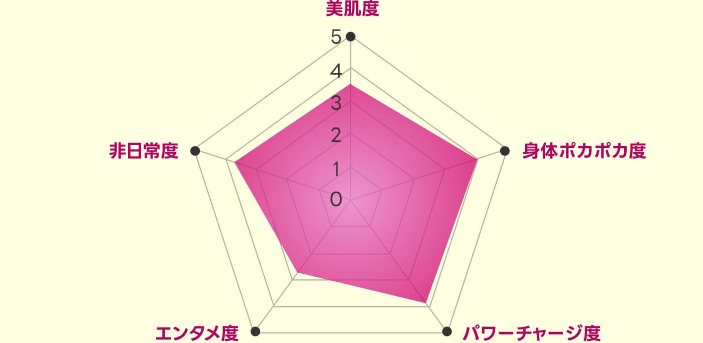 炭酸泉のテイスティングや鉱泉料理など、多方面から温泉が楽しめるのでエンタメ度が高得点。「身体の芯から温まった」という感想もあり、身体ポカポカ度の高さも見逃せない。