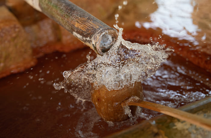 「飲める温泉」。飲泉場で自分で汲んで飲んでみて。宿ごとに味が違うので飲み比べを